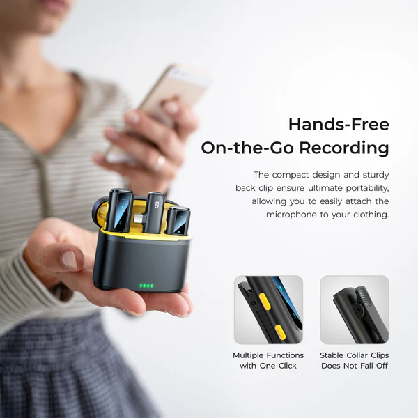 - COMPLETE PACKAGE: Inside the box - 2x Microphone Transmitter, 1x Microphone Receiver, 1x USB to Type C Charging Cable, 2x Wind Wool, 1x Type-C to Lightning Connector, and an Instruction Manual. All you need to get started right away.