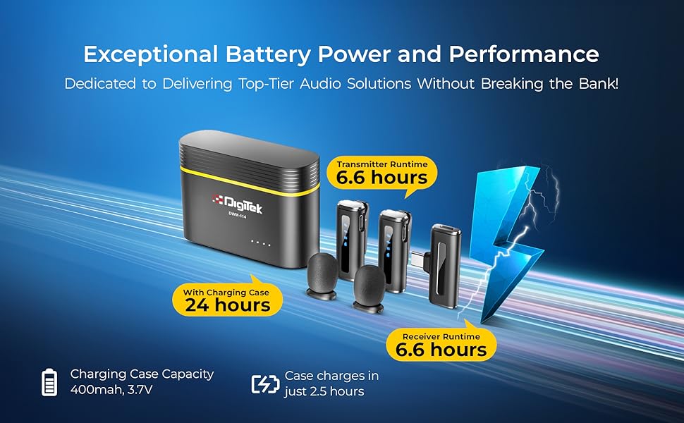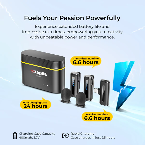Be the first to review “Digitek® (DWM-114) 2-in-1 Wireless Microphone, 2.4GHz, 6.6Hr Battery, Noise Reduction, 40m Range, 360° Sound Capture, Plug n Play, iPhone & Android Compatible, for Video Recording, Interview, Vlogging!” Cancel reply