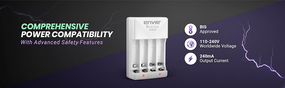 - SUPPORTS INPUT: 220V AC, 50Hz , SUPPORTS OUTPUT: AA/AAA 2.4V DC 240mA , AA20Max2 AA20Max4 , AAA 120mAx2 AAA 120mAx4. It works best with Envie Batteries.
