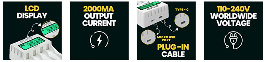 | Special Features | This charger can charge 1/2/3/4 pcs of AA/AAA Ni-MH/Ni-Cd rechargeable Batteries |