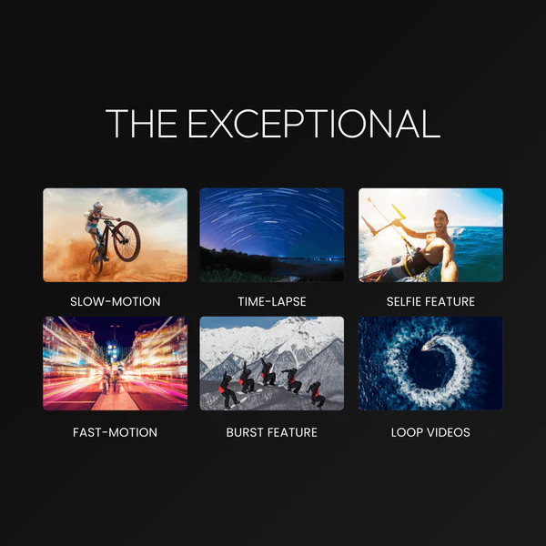 - This camera almost covers all the functions that you need or can imagine. For example, loop recording, time-lapse recording, slow motion, self-timer, burst photo, screen saver, upside down, drone, travel vlogging, white balance and soon.