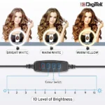 - Upgraded Dimmable 12" Selfie Ring Light, Digitek 12" ring light adopted the newest technology to emit more soft light with 3 color lighting modes: white, warm yellow, and warm white. 12-inch large size and 120 LED bulbs get you an outstanding look when doing Make-Up, Live Streaming, Selfie, Video chatting, Vlog, etc. Each lighting mode has 10 adjustable brightness to choose.