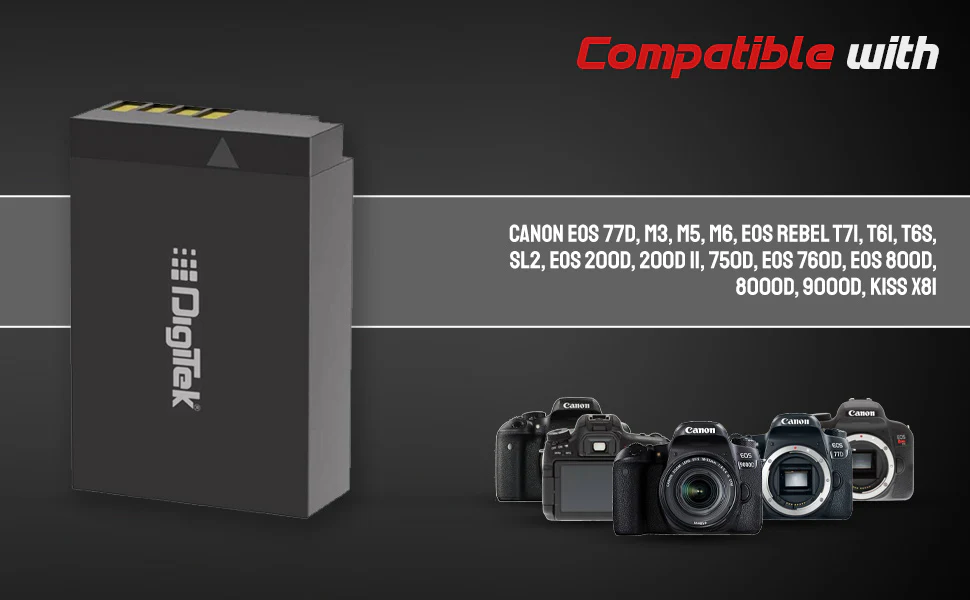 - Compatibility: Battery Is Compatible With Canon Eos 77D, M3, M5, M6, Eos Rebel T7I, T6I, T6S, Sl2, Eos 200D, 750D, Eos 760D, Eos 800D, 8000D, 9000D, Kiss X8I